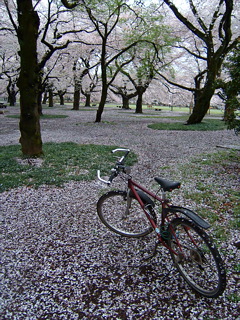 花びらの絨毯と、毎度色んな所に連れてってくれる僕の自転車。